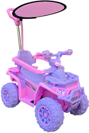 FUNCIONES:6VBatería Recargable 4 A/h1 MotorLuces Frontales3 Km/hr (Por seguridad para niños de edades de 2 a 3 años es la velocidad recomendada).Adelante y ReversaSonido y MúsicaBluetoothEntrada USBBotón de EncendidoBarras de seguridadCubremanosParrilla delantera y traseraToldo/Sobrilla con Bastón DirigibleLlantas de PVC